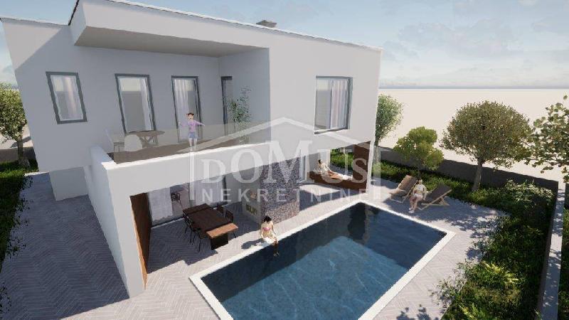 Prekrasna vila s bazenom na mirnoj lokaciji u Tribunju, udaljena svega 360m od plaže, okružena borovom šumom, Vila će imati ukupnu korisnu površinu od 212,11m2, izgrađena na dvije etaže P + 1, sagrađena na parcela od 591m2. U prizemlju će biti natkriveni ulaz, predsoblje, spremište / kotlovnica, gostinjski toalet, jedna prostrana spavaća soba s vlastitom kupaonicom i garderobom te prostrana kuhinja s blagovaonom i dnevnim dijelom u jednoj cjelini. Iz dnevnog dijela je izlaz na prostranu natkrivenu terasu od 34m2 na kojoj je vanjski roštilj i ljetna kuhinja povezana sa sunčalištem i bazenom 8mx4m u sklopu kojeg je mali dječji bazenčić te lijepo uređen vrt sa sustavom navodnjavanja. Unutarnjim stubištem se ide na prvi kat kuće gdje se nalaze još tri prostrane spavaće sobe, dvije kupaone, garderoba te terasa od 16m2. Nekretnina će biti opremljena panelima za pripremu tople vode, dizalice topline za grijanje, podno grijanje u cijeloj kući, struja jačine 18 Kw, fasada ukrašena deko kamenom, termoizolacija kamena vuna debljine 10 cm, PVC stolarija s roletama na el. pogon, komarnici, grijani bazen. Dvorište uređeno i opremljeno hortikulturom. Udaljenost od mora je 360 m, a od centra 1000 m.