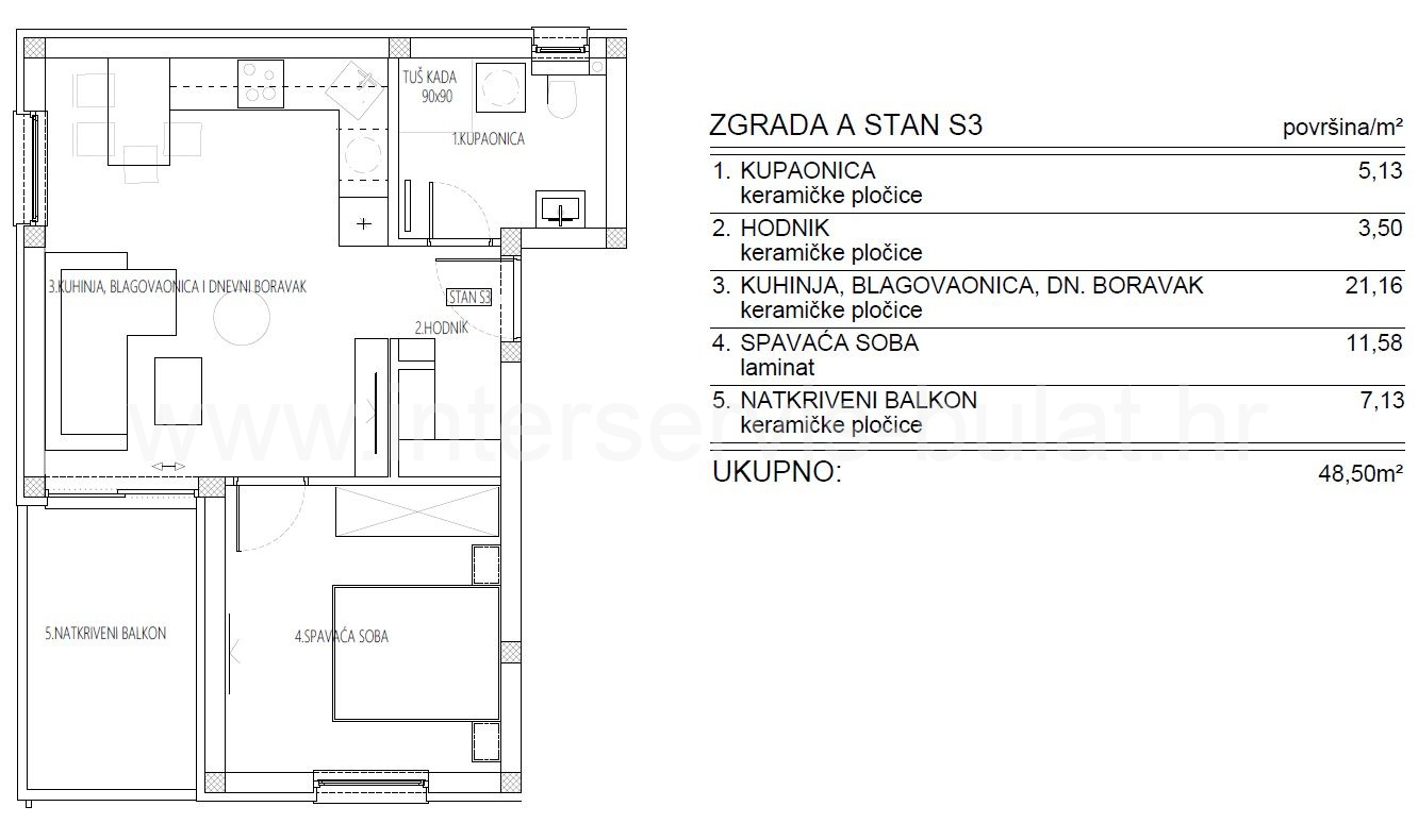 .::: Stan u novogradnji u Ražinama :::. U naselju Donje Ražine pokraj Šibenika grade se četiri stambene zgrade, svaka po šest stanova. Predmetni stan se nalazi na 2. katu zgrade A. Raspolaže sa 48,5m2 stambene površine, a pripada mu i jedno parkirno mjesto. Stan se sastoji od hodnika, kupaonice, spavaće sobe i kuhinje s blagovaonicom i dnevnim boravkom sa izlazom na natkriveni balkon. Na zgradama je predviđena fasada sa kamenom vunom, opremljena PVC stolarijom sa električnim roletama, kvalitetnim oblogama i podovima, podnim grijanjem u kupaonicama i klimama. Šibenik je udaljen oko 2km, a plaža na Brodarici oko 2,2km. Predviđeni završetak gradnje je kraj 2027. godine. Obilazak nekretnine moguć je uz prethodni dogovor i rezervaciju termina (minimalno dva dana unaprijed). Molimo pri telefonskom kontaktu obavezno navesti šifru objekta (ID nekretnine). Radujemo se Vašem pozivu.