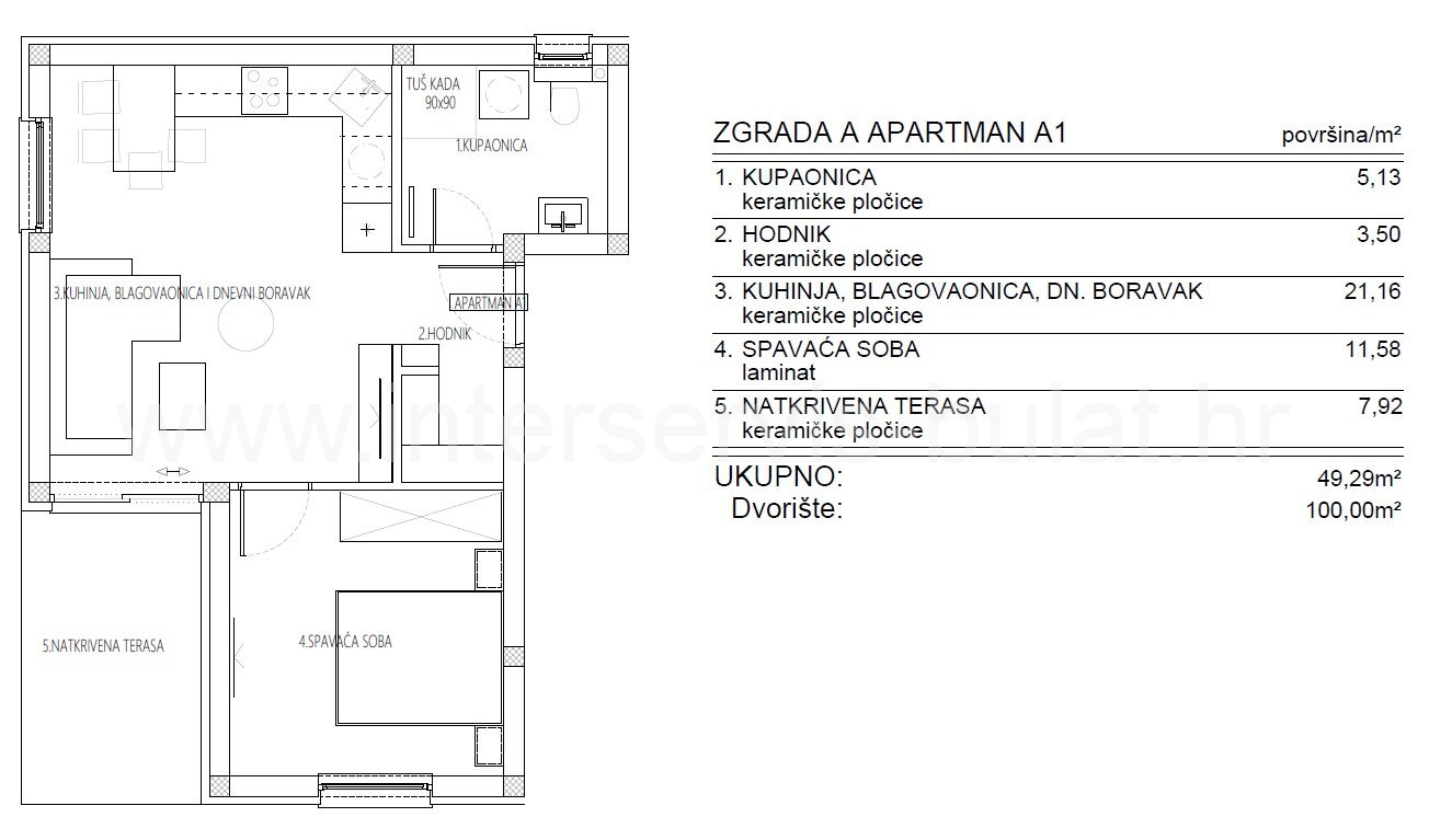 .::: Stan u novogradnji u Ražinama :::. U naselju Donje Ražine pokraj Šibenika grade se četiri stambene zgrade, svaka sa po šest stanova. Predmetni stan se nalazi u prizemlju zgrade A. Raspolaže sa 49,29m2 stambene površine, a pripada mu i jedno parkirno mjesto, te vrt površine 100m2. Stan se sastoji od hodnika, kupaonice, spavaće sobe i kuhinje s blagovaonicom i dnevnim boravkom s izlazom na natkrivenu terasu i dvorište. Na zgradama je predviđena fasada s kamenom vunom, opremljena PVC stolarijom s električnim roletama, kvalitetnim oblogama i podovima, podnim grijanjem u kupaonicama i klimama. Šibenik je udaljen oko 2km, a plaža na Brodarici oko 2,2km. Predviđeni završetak gradnje je kraj 2027. godine. Obilazak nekretnine moguć je uz prethodni dogovor i rezervaciju termina (minimalno dva dana unaprijed). Molimo pri telefonskom kontaktu obavezno navesti šifru objekta (ID nekretnine). Radujemo se Vašem pozivu.