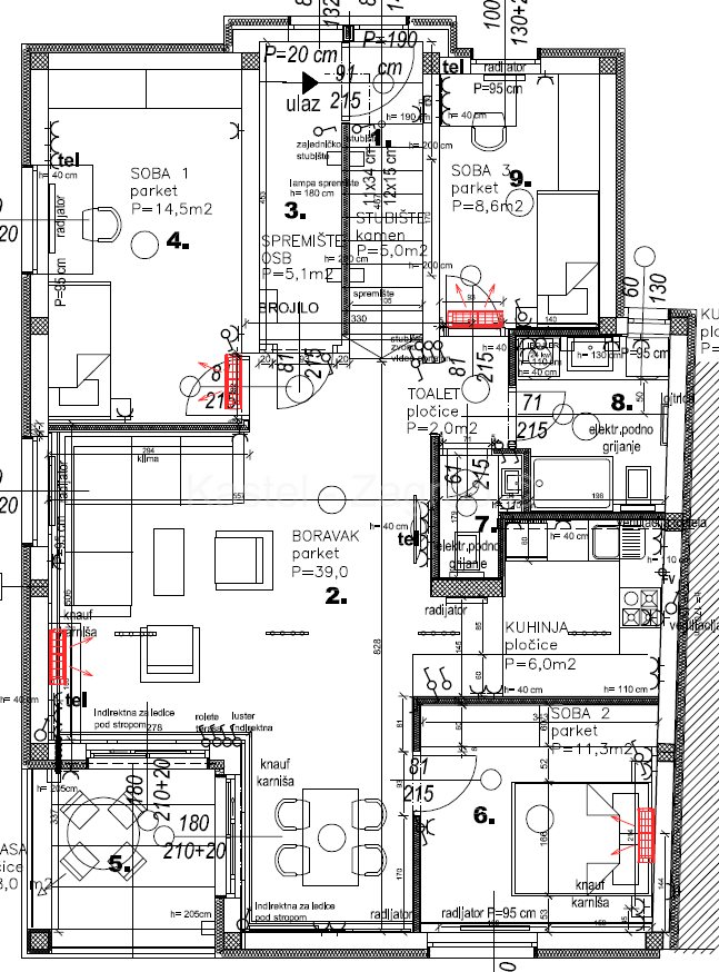 PENTHAUS TREŠNJEVKA Potpuno nova etaža u zgradi od ukupno tri nadzemne etaže. Zgrada i dvorište 2025. godine kompletno obnovljenI. Stan u zgradi na odličnoj lokaciji, 10 min hoda do Trešnjevačkog placa povučena od glavne prometnice. Stan se sastoji od zatvorenog dijela 97 m2 kojeg čine hodnik, kupaonica, wc, kuhinje s blagovaonom, veliki dnevni boravak s izlazom na terasu 8 m2, tri spavaće sobe, spremište. Stanu pripada parkirno mjesto u dvorištu 15m2. Vrhunski materijali i oprema: hrastov parket velikih dimenzija sa mat lakom vrhunska keramika 1. klase dimenzija 60 x 120 cm grijanje radijatorima preko kondenzacijskog bojlera hlađenje je putem split-klima jedinica koje su postavljene u svaku sobu renomiranog proizvođača LG, vanjska klima jedinica su smještena je na ravnom krovu zgrade sanitarije u kupaonicama klasa tip. Grohe, Hansgrohe i sl. walk in tuš sa zatvorenom tuš kabinom portafon ulazna vrata u stan protuprovalna, protupožarna i protudimna vrhunska PVC stolarija Salamander greenEvolution MD profil je elegantne moderne antracit boje, ugradbene dubine 76 mm s pet komora i tri brtve, te ispunjenim plinom argonom alu rolete na struju Kontakt: Siniša Čubrić, mob: 091 234 9877 ili mail: sinisa@kastel.hr
