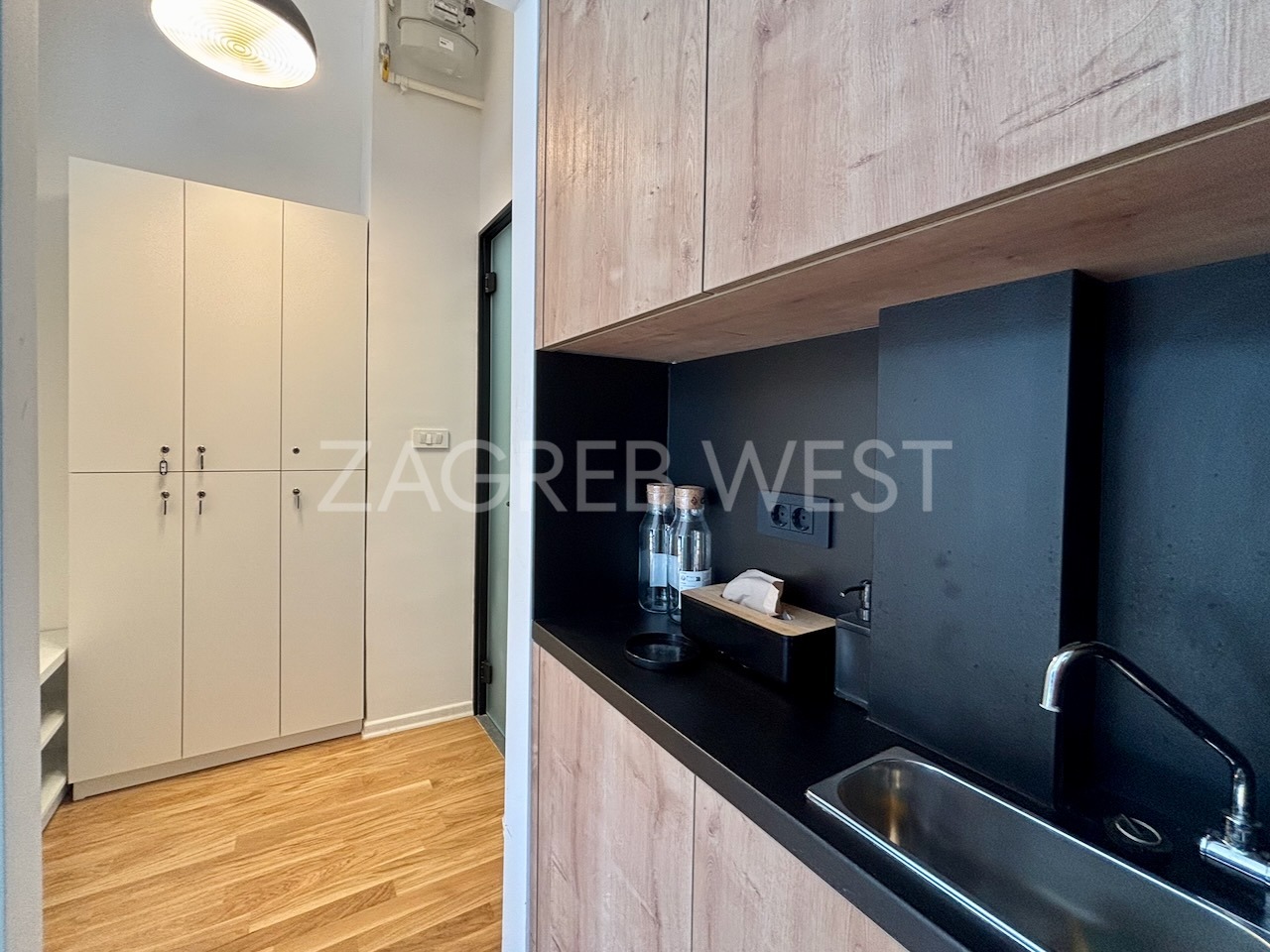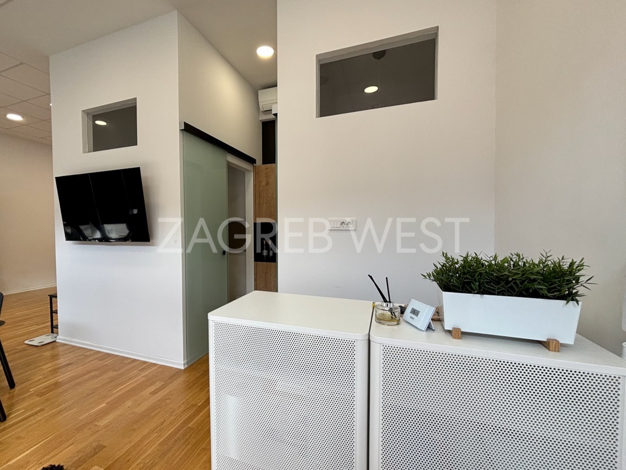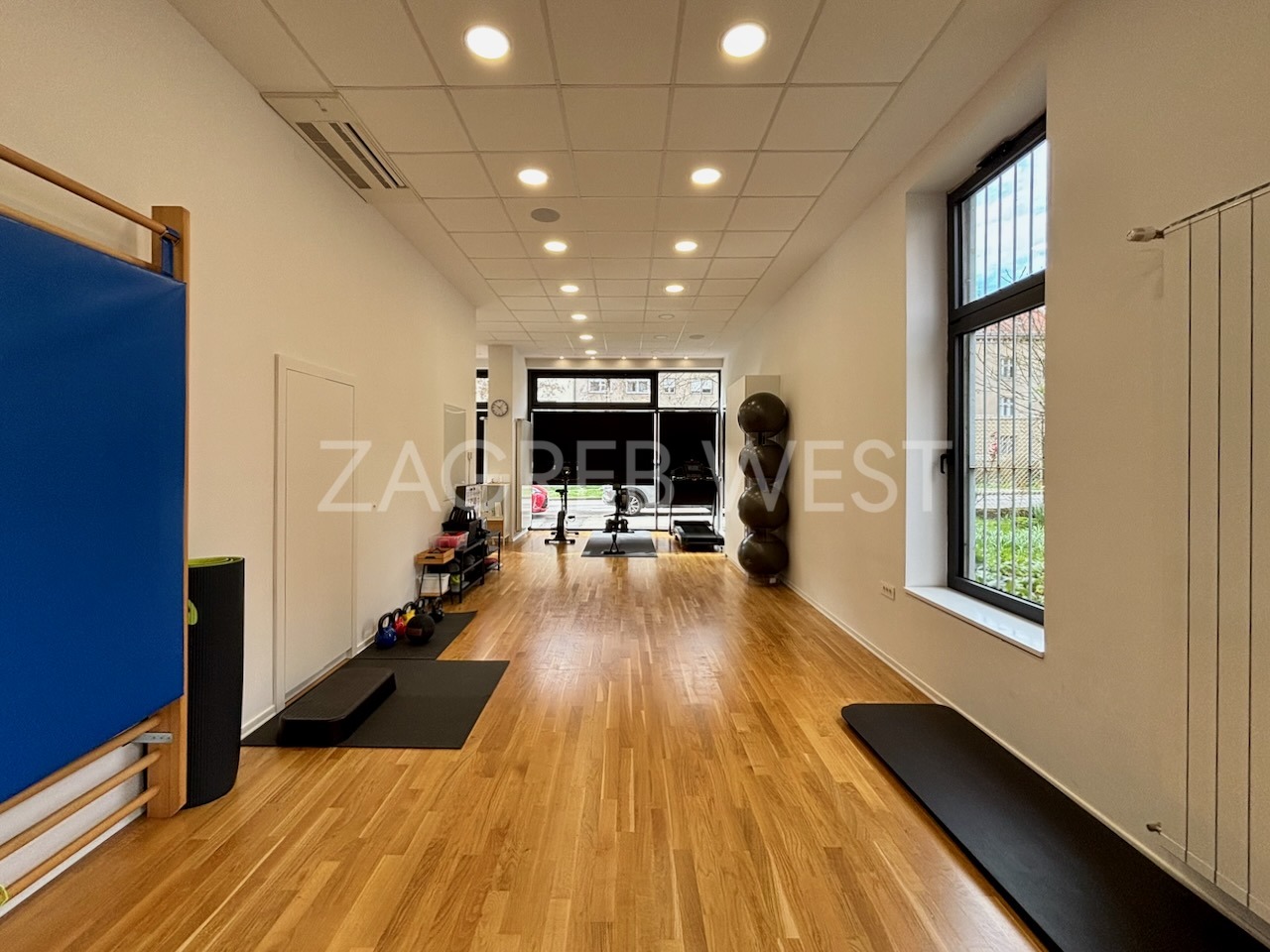 Prekrasan, vrhunski uređen poslovni prostor koji je trenutno opremljen za djelatnost fitnessa i rekreacije, ali se može isprazniti i prenamijeniti u uredski. Sastoji se od velike prostorije, koja se može podijeliti u manje, recepcije, čajne kuhinje i dva sanitarna čvora (wc, tuš, garderoba). Stropovi su visoki, u njih je ugrađena rasvjeta i klima uređaji, na podu je kvalitetan hrastov parket, vanjska stolarija je velikih dimenzija i pruža visoku energetsku učinkovitost. Opremljen je s klimom, centralnim grijanjem, roletama, rešetkama na prozorima i alarmom za sigurnost. Zbog velikih prozora i orijentacije prostor je pun dnevnog svjetla. Iznajmljuje se isključivo dugoročno, uhodanim obrtima s odličnim bonitetom, ili tvrtkama sa stabilnim poslovanjem. Ugostiteljska djelatnost i maloprodaja hrane su isključeni. Nalazi se na vrhunskoj, elitnoj lokaciji u neposrednoj blizini Britanskog trga.