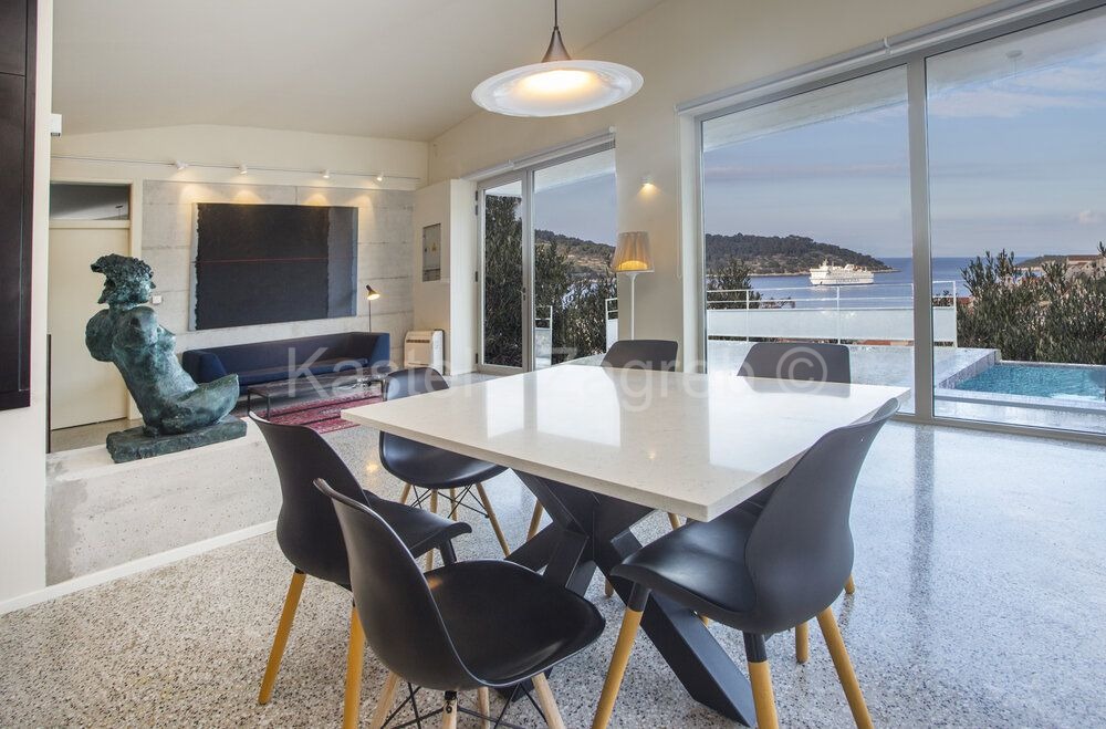 Vis, moderna NOVOGRADNJA, luksuzna villa površine 117 m2 na parceli 680 m2 s otvorenim pogledom na more i Višku uvalu. Nalazi se na idealnoj lokaciji udaljena 400 metara do mora i svih potrebnih sadržaja. Sastoji se od velikog otvorenog dnevnog boravka sa opremljenom kuhinjom, dvije osunčane sobe s velikim staklenim stijenama i 2 elegantne kupaonice. Dio dvorišta je velika terasa sa prostorom za druženje sa roštiljem i infinity bazenom. Vila je luksuzno uređena, korišteni su samo najkvalitetniji materijali, namještaj i oprema. Udaljena 83 km od Zračne luke Split. Kontakt: 095 910 2356