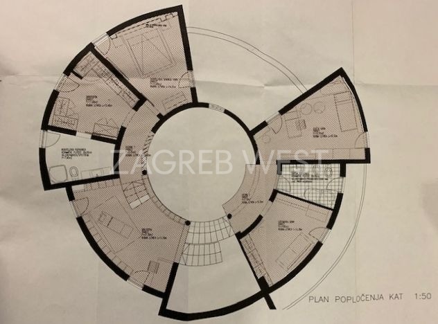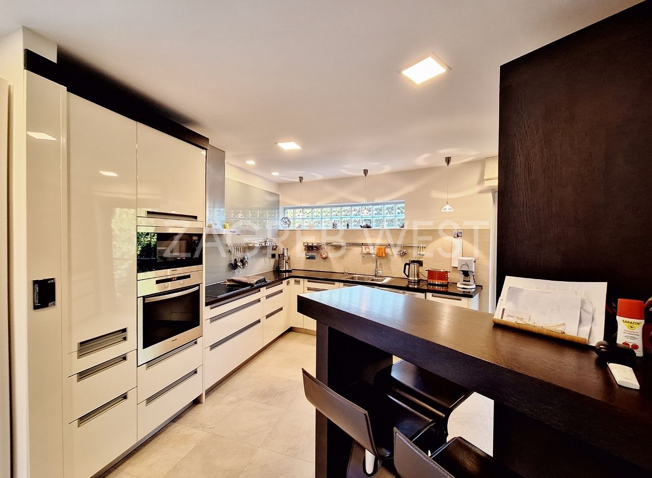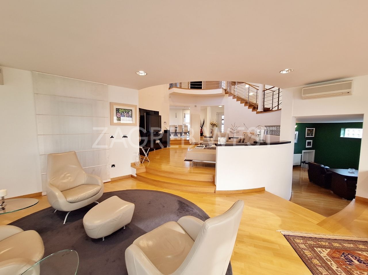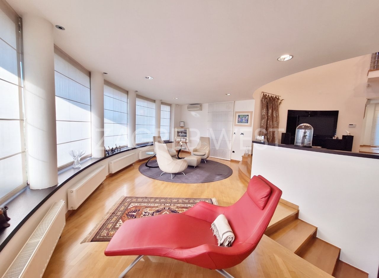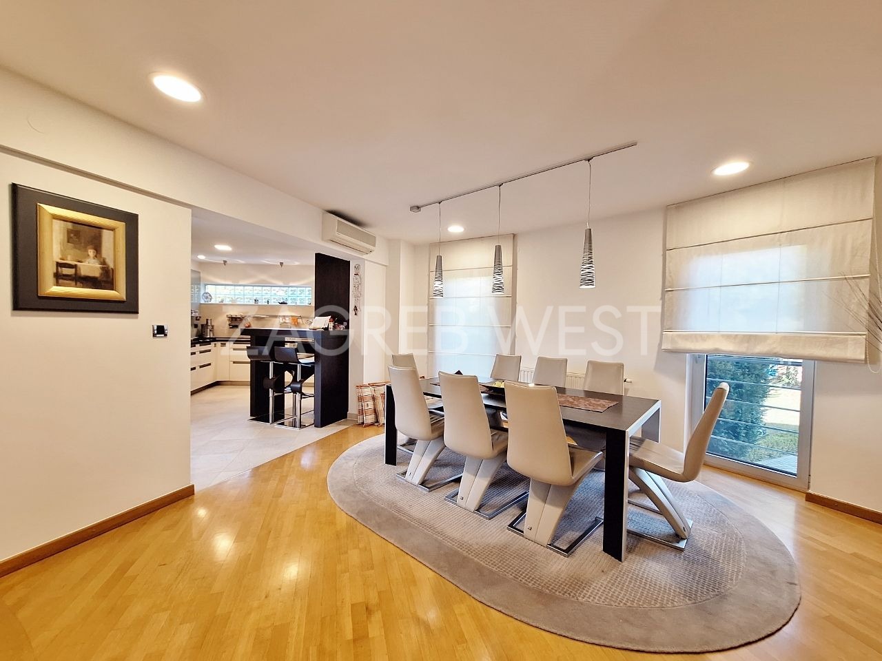 Luksuzna, samostojeća kuća, sofisticiranog rasporeda i uređenja, izgrađena je i opremljena visoko kvalitetnim materijalima. Interesantan kružni prostor prostire se na više etaža, i vrlo je ugodan za svakodnevan život. U podrumskoj etaži nalaze se kotlovnica, ostave, vinski podrum te prostor za fitness i druženje. Prizemlje je skoro u potpunosti otvoreno, a sastoji se od reprezentativnog velikog dnevnog boravka, kuhinje, blagovaonice iz kojih se izlazi na terasu i u vrt; radnog prostora i gostinjskog wc-a. Na najgornjoj etaži nalaze se tri spavaće sobe, garderoba povezana kupaonicom, dodatna kupaonica i radna ili dodatna spavaća soba. Kuća je okružena prekrasno uređenom njegovanom okućnicom od 661m2, što vlasnicima omogućava uživanje na otvorenom. Parkiranje je u garaži (2 automobila) i vanjskim parkirnim mjestima (3 automobila). Prostor je vrlo luksuzno opremljen. Velika prednost je i lokacija, blizina svih potrebnih sadržaja, javnog prijevoza i glavnih gradskih prometnica, što, kuću, uz njenu uređenost, čini vrlo ugodnom za svakodnevan život, svega 20min od centra grada. Želite li privatnost i mir, ovo je kuća za vas.