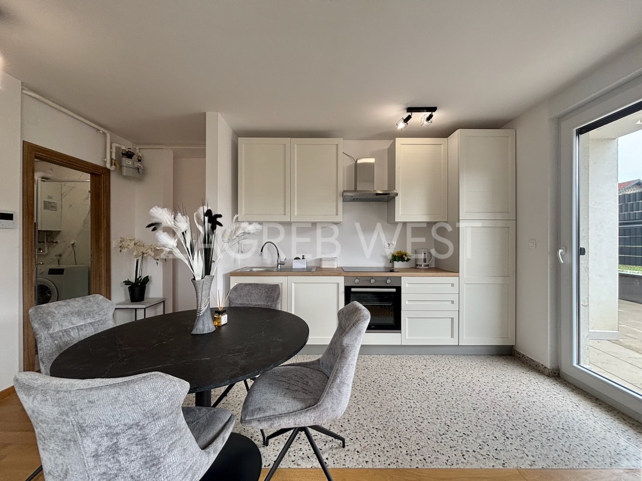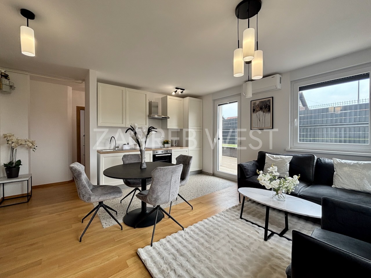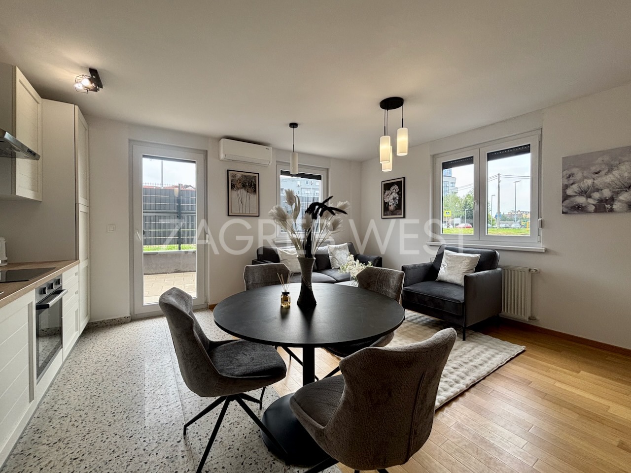 Nov i nikad korišten, potpuno namješten i opremljen (svi aparati, klima, protuprovalna vrata, ugrađeni ormari) stan u prizemlju novogradnje, koja se nalazi u blizini autobusne stanice i svih ostalih sadržaja. Sastoji se od dnevnog boravka s kuhinjom i blagovaonicom, iz kojih se izlazi na veliku terasu od 20m2, dvije spavaće sobe i kupaonice. Stan je pun dnevnog svjetla. Dolazi s nenatkrivenim parkirnim mjestom.